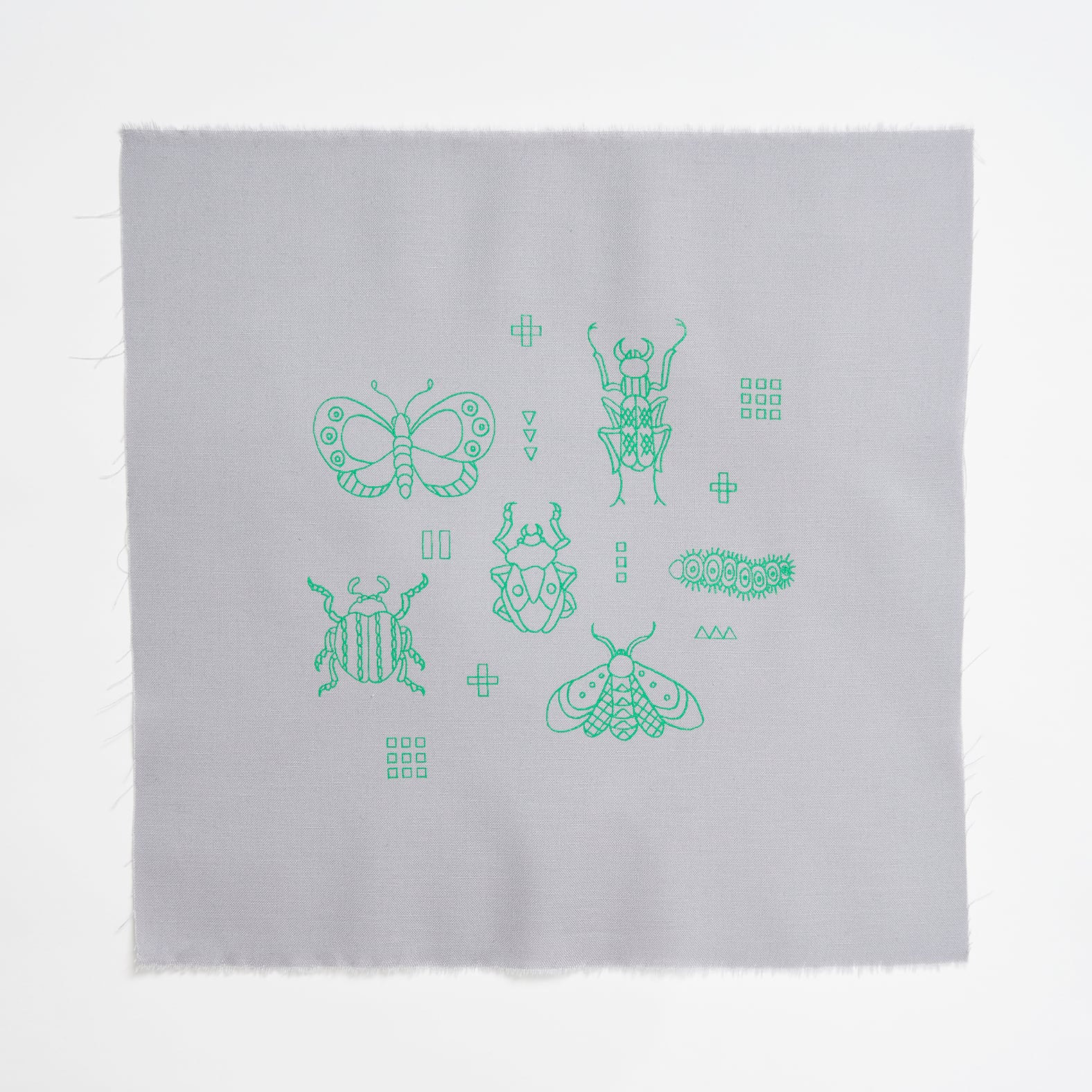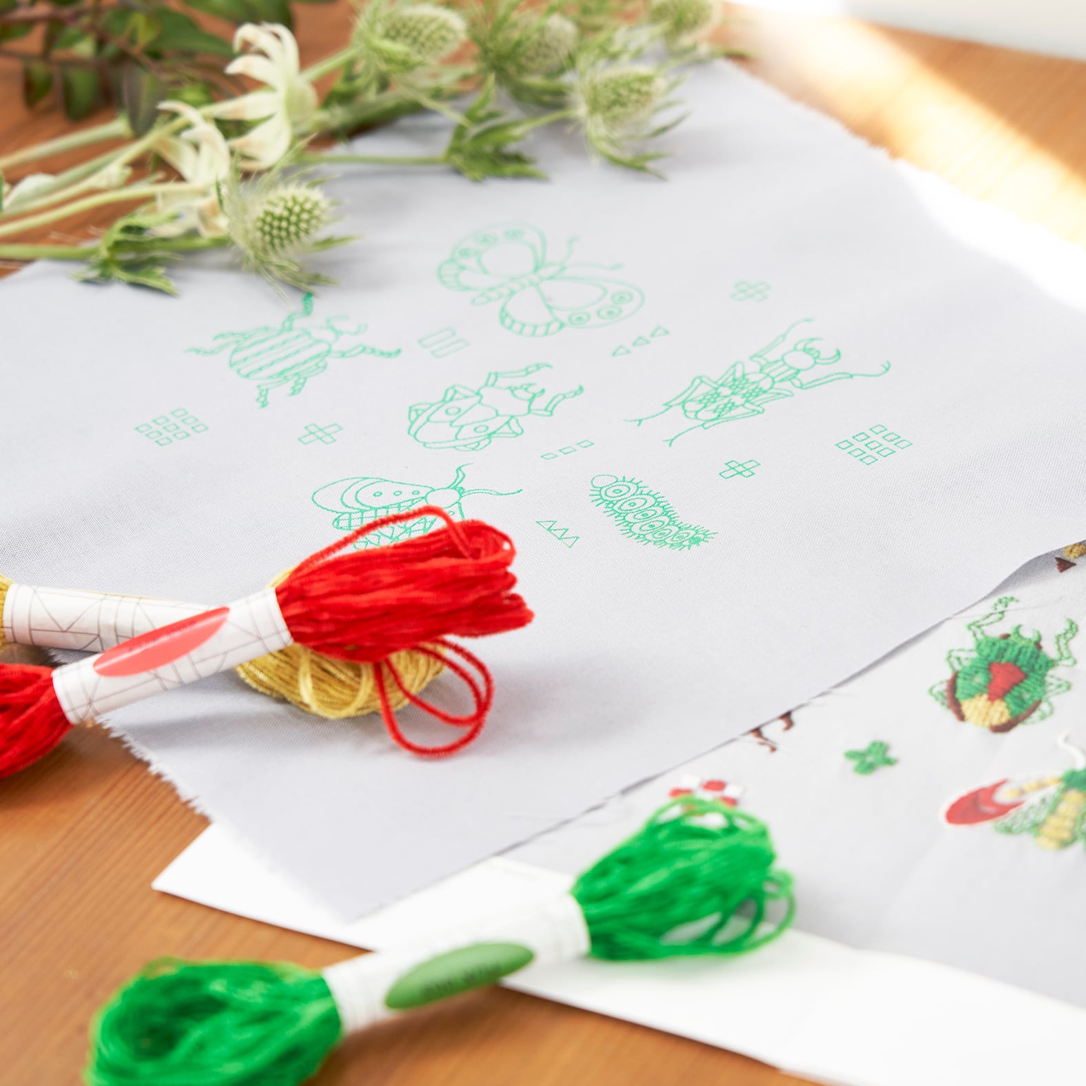 キットは、糸に合わせて描かれた図案とセットで販売します。図案はどれもとっても素敵で、糸だけみていたときには想像できない仕上がりになっています。愛らしい猫の姿が描かれたもふもふ。水槽の中を優雅に漂うクラゲや微生物をカラフルに刺繍できるきらきら。ふかふかは昆虫の短い毛足に例えられました。