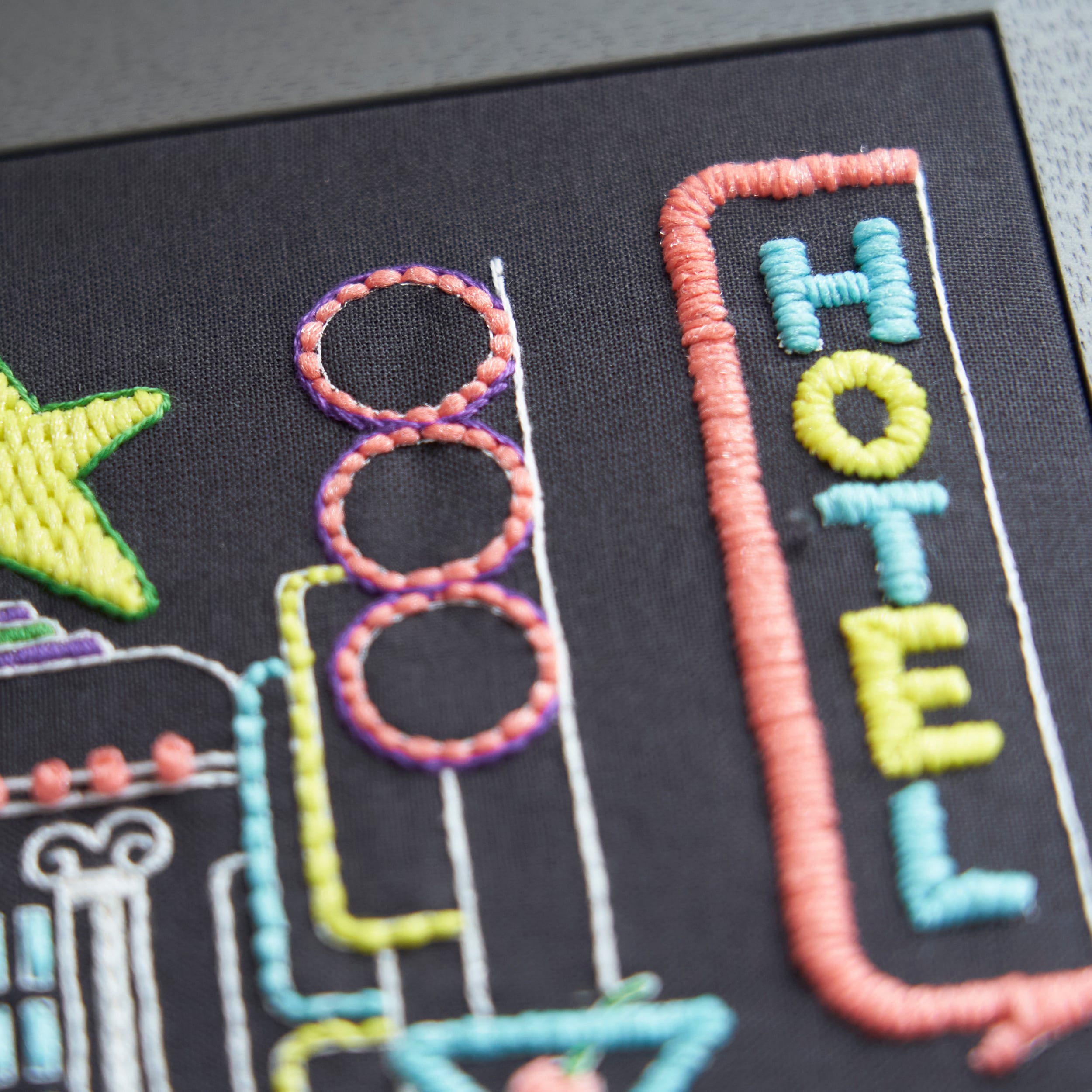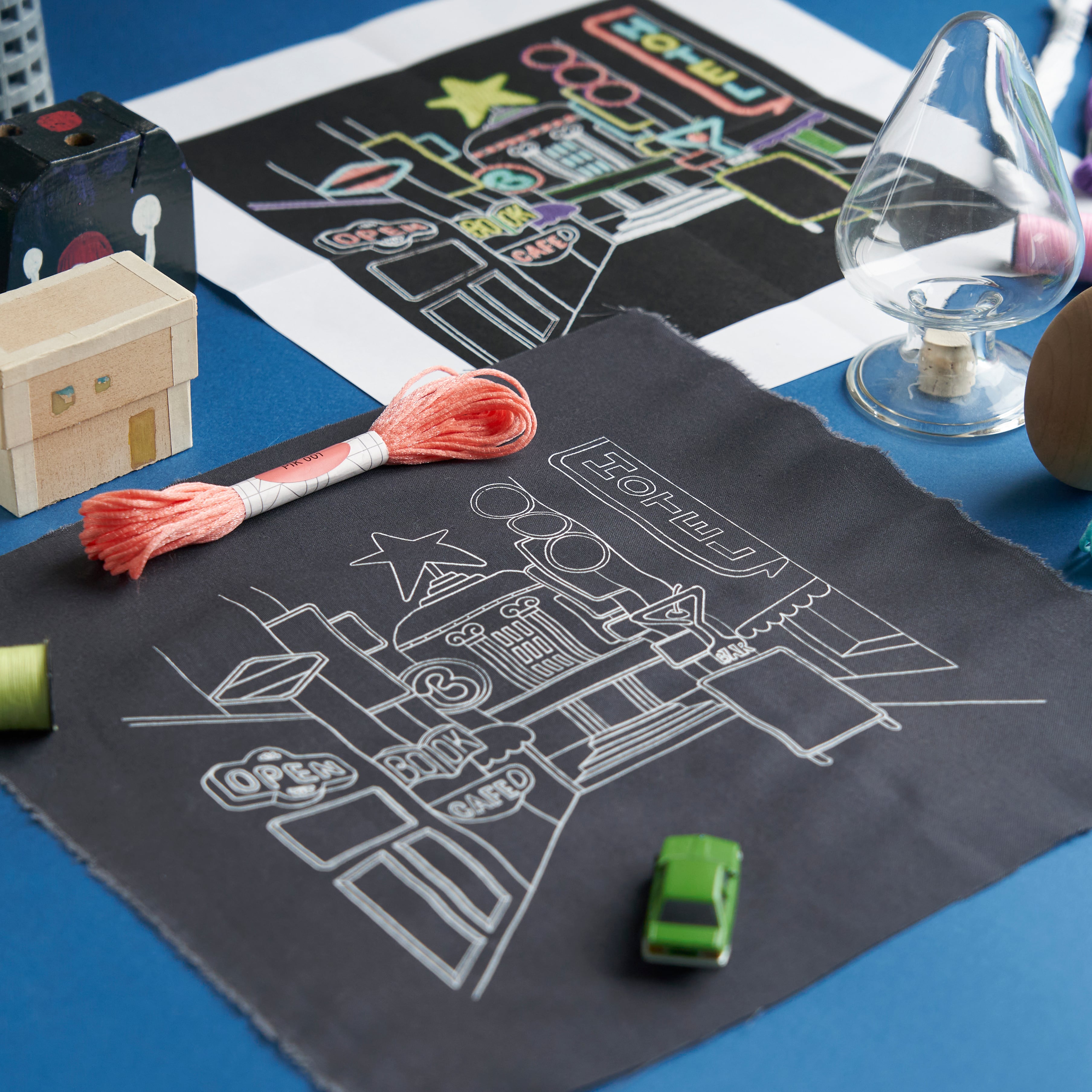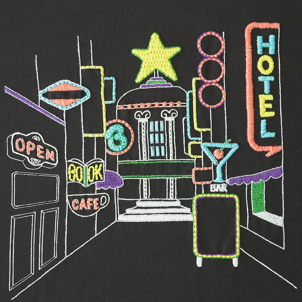 夜空に映えるネオンやライトのようなぴかぴかとした輝きを表現した刺繍糸。 ネオン管をイメージした色の糸を光沢のある ネット状の糸で包み込むようにして仕上げました。1 本でも存在感があるので、シンプルなステッチでもとても豪華な仕上 がりに。伸縮性のある糸なので、ひと針ひと針調子を整えながら刺し進めるとより美しく仕上がります。