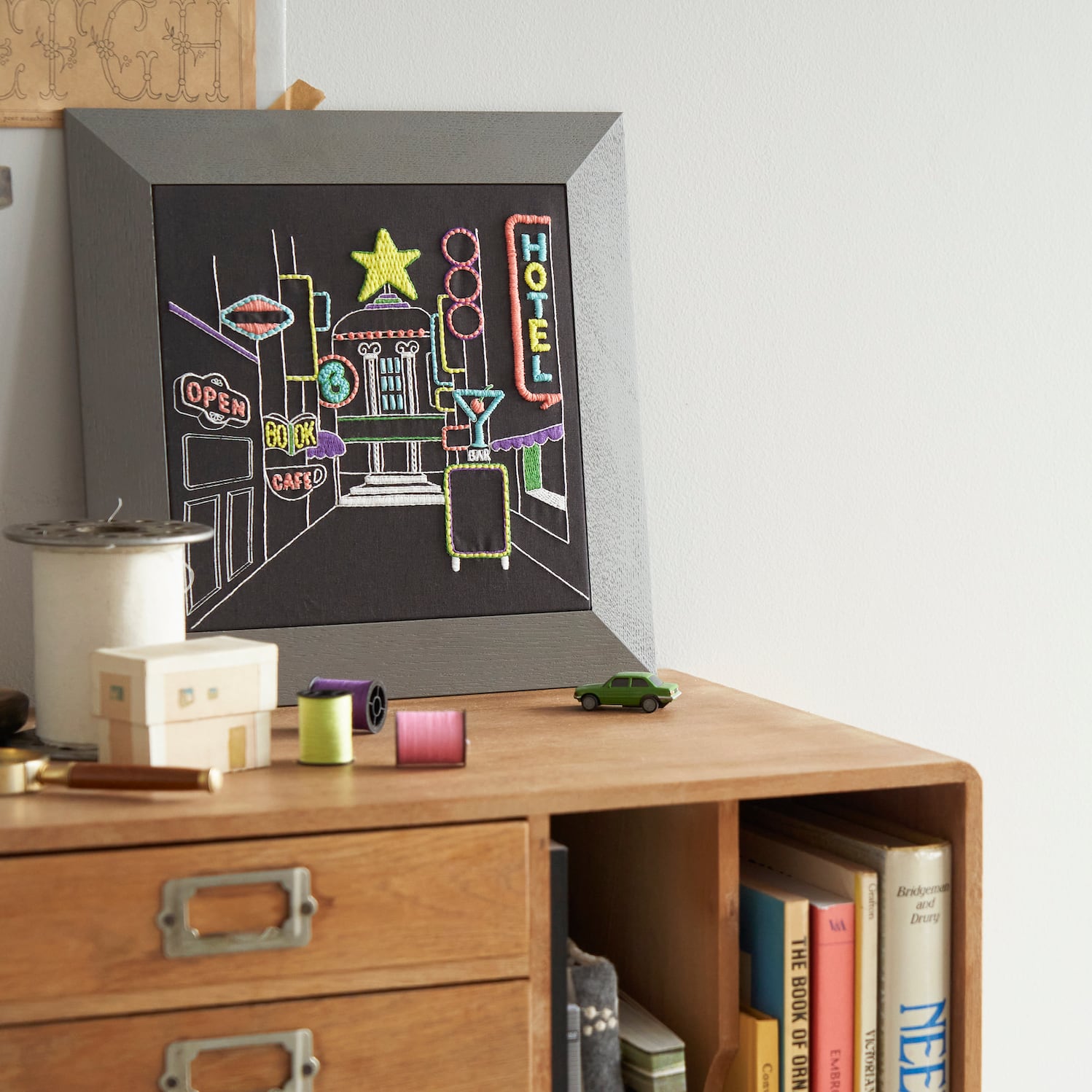 キットの中には見本に使われているすべての刺繍糸と専用の刺繍針、糸通し、図案が印刷された布、ステッチ練習用の布が専用のボックスに入っています。ボックスのフタは切り取って作品の額装としても使えます。個性豊かな糸を使って、あなたも一緒に新しい刺繍の世界を切り開きませんか?