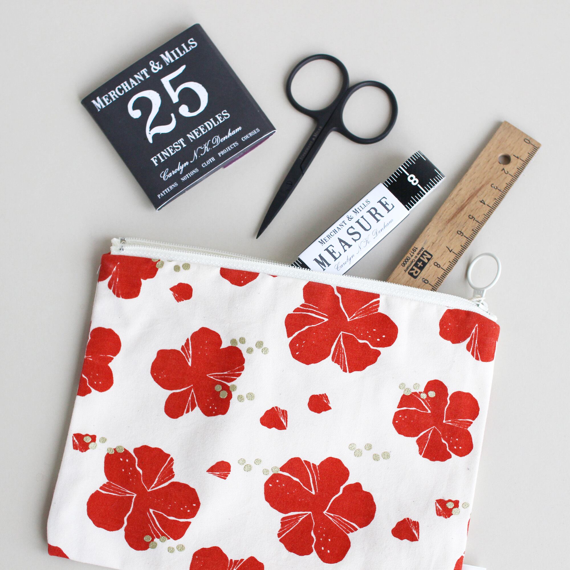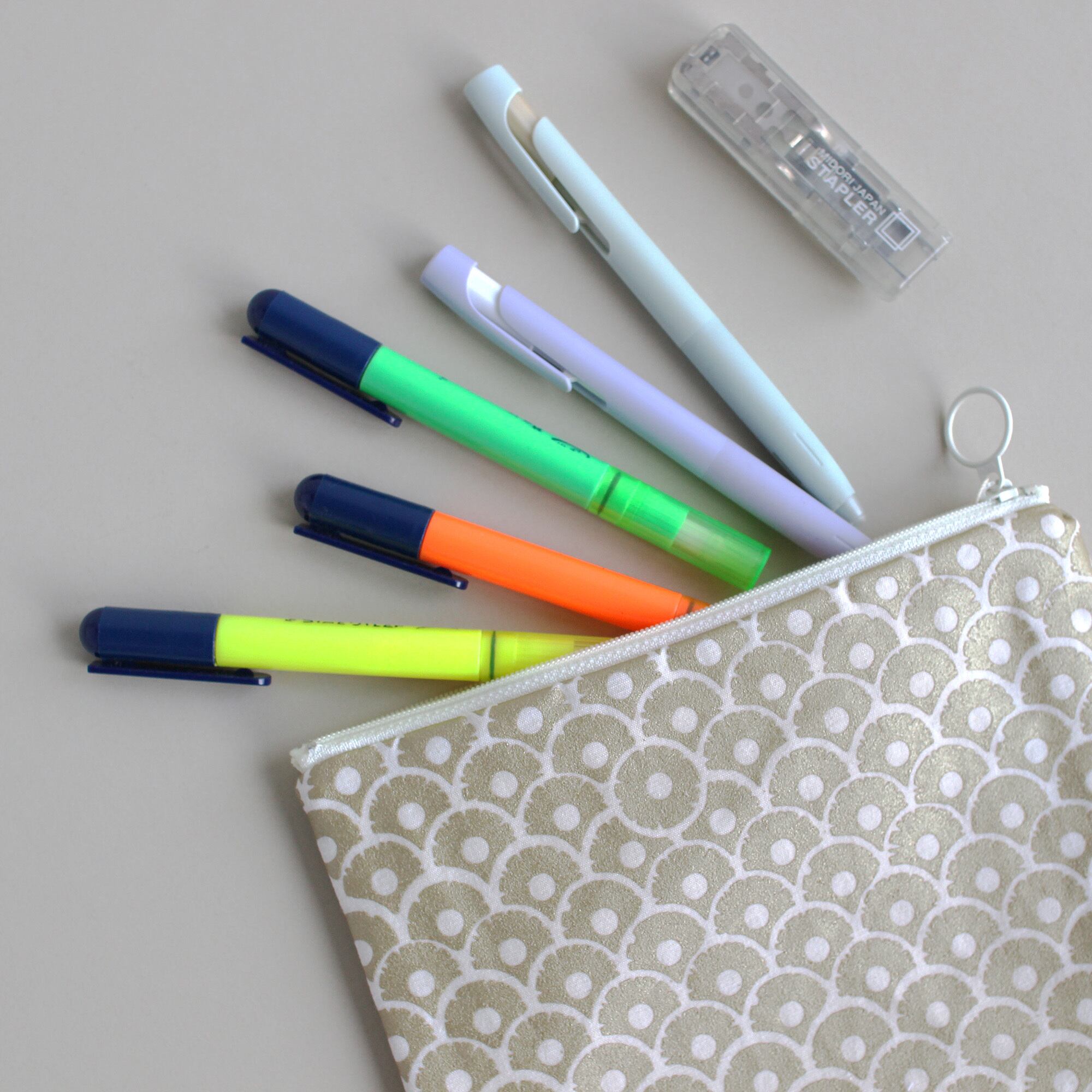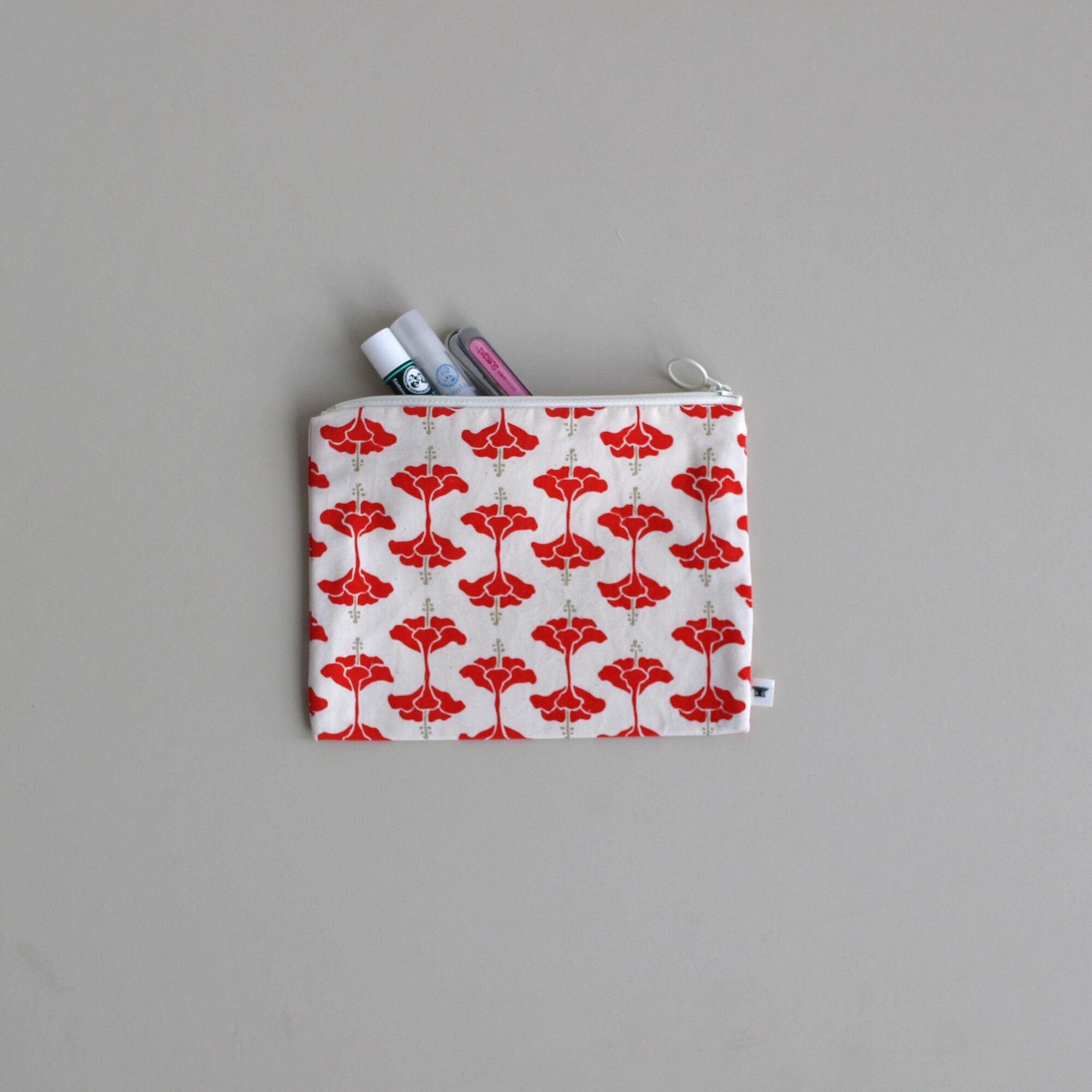マチのないフラットなポーチ。化粧ポーチやペンケース、散らかりがちなガジェット類の収納などカバンの中で活躍します。岡山県・石井織物の無漂白・無のりの綿タッサー生地を、富士吉田の丸幸産業で染色し、奥田染工場で箔プリントしました。もちもちとした自然な触感と目を引くプリントが特徴です。