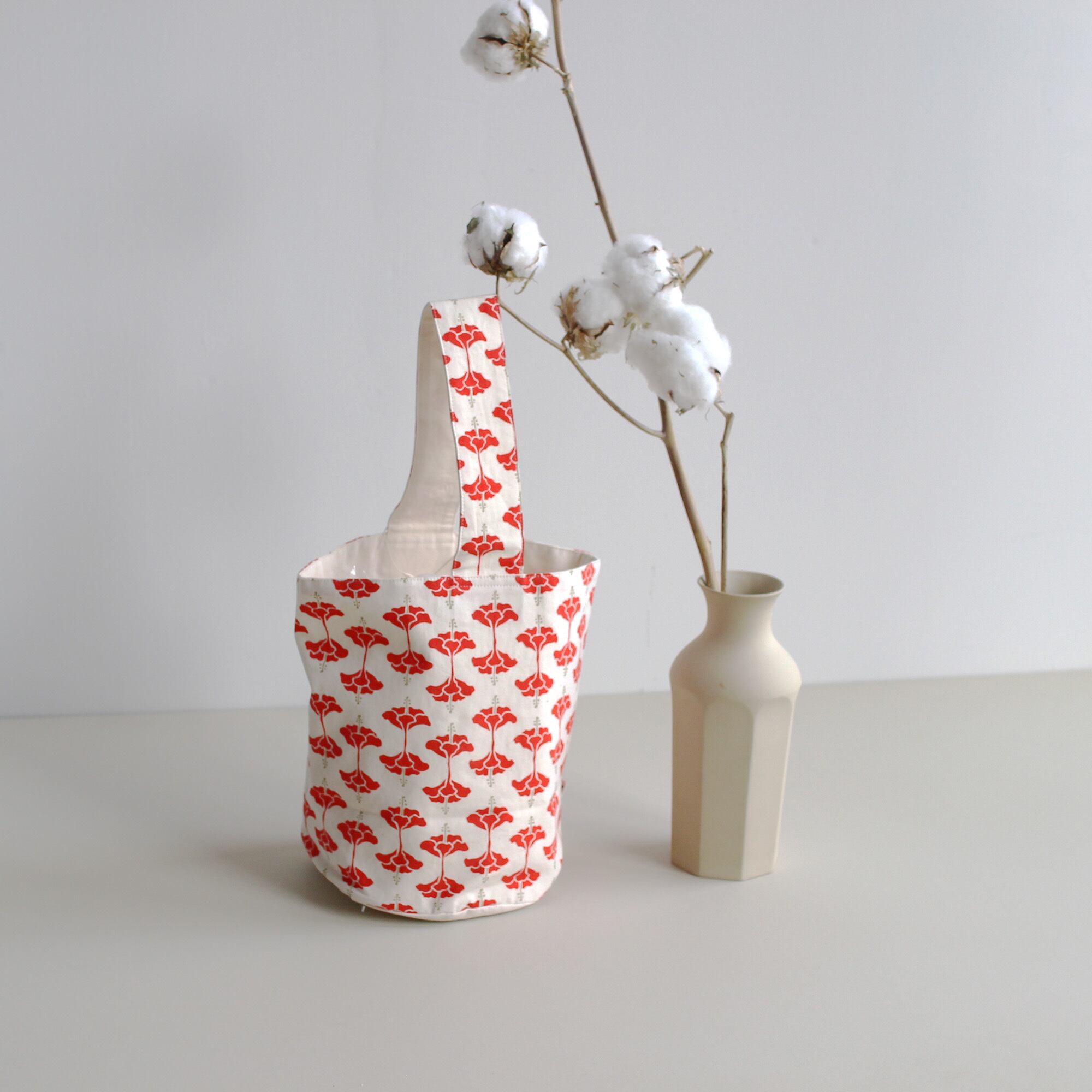 バケツの形をしたワンハンドルのトートバッグです。お弁当を入れるランチバッグや、携帯と財布・少しの小物だけを入れた身軽なおでかけのときに重宝します。岡山県・石井織物の無漂白・無のりの綿タッサー生地を、奥田染工場でプリントしました。花弁にはラメプリントが使われています。もちもちとした自然な触感と目を引くプリントが特徴です。