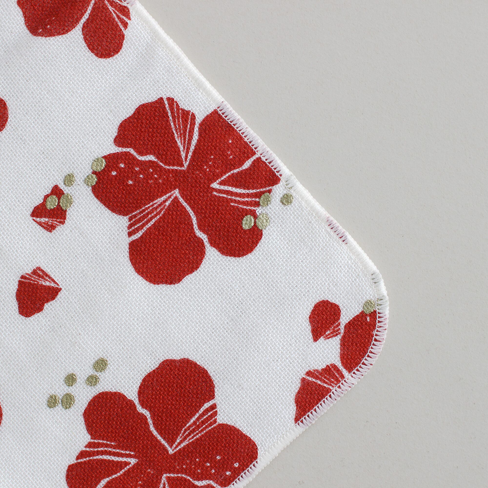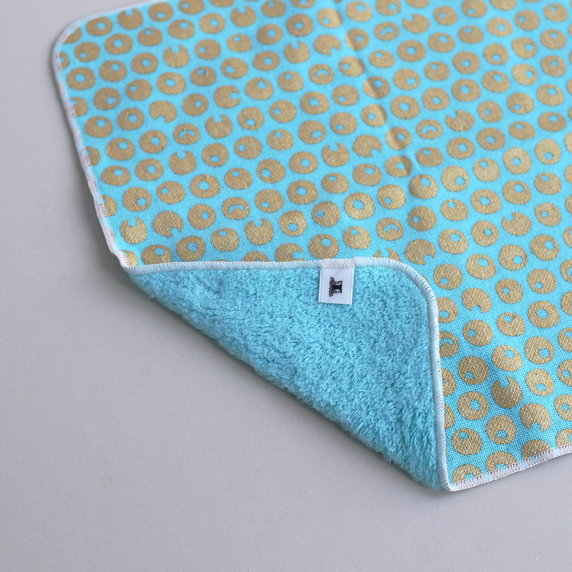 表がガーゼ、裏がタオル地のハンカチです。分厚くないハンドタオルサイズで持ち歩きやすく、紙の封筒に入ったパッケージは贈り物としてもオススメです。和歌山県・原田織物のタオル生地を、奥田染工場でプリントしました。花弁にはラメプリントが使われています。撚りが少なく吸水性のある生地が特徴です。